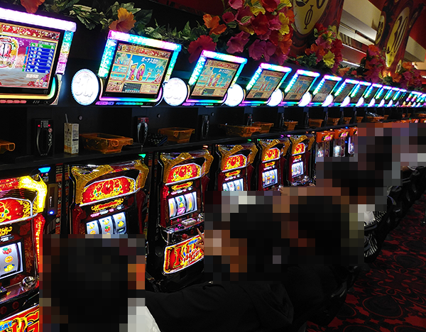 パチスロコーナーに目を向けると、サークル状のシマとなっている「バジリスク~甲賀忍法帖~絆」や最新台である「アレックス」など、さまざまな機種が大盛況。