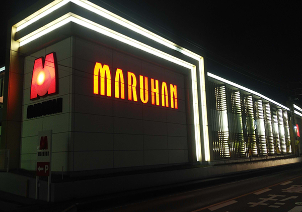 舞台となった「マルハン大間々店」に到着したときには日が落ちており、ライトアップされた外観がとてもキレイに輝いていた。