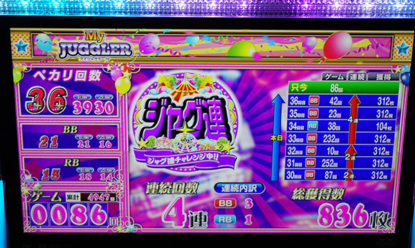 『マイジャグラーⅣ』の最終的な平均ゲーム数は4847G。平均ボーナス回数は約32回であった。