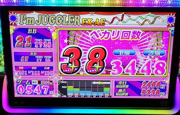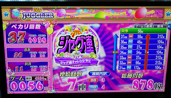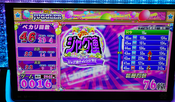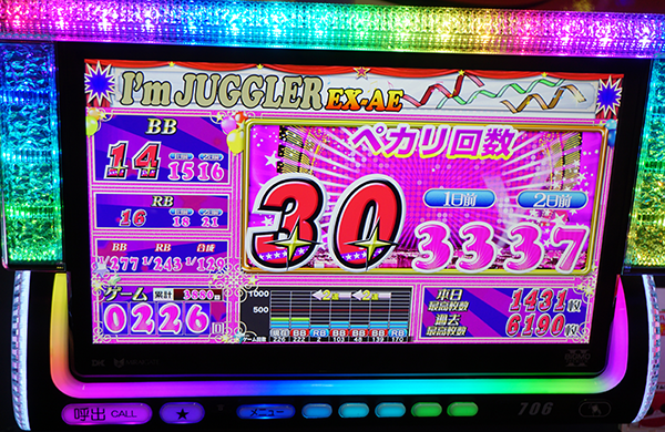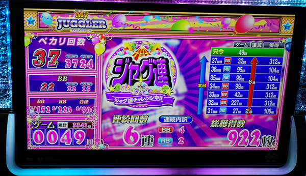 7台が17時の時点で、30回以上のボーナスに当選。そのうちの1台は3341Gを消化し、22回のBIGと15回のREGを獲得していた。