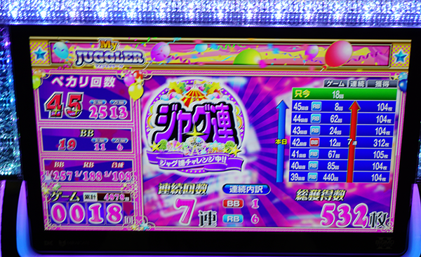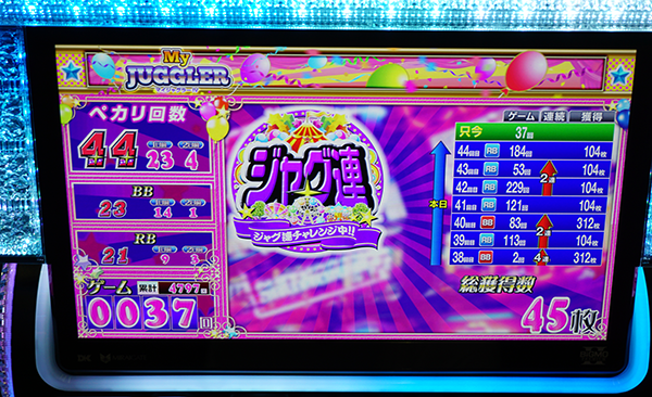 遊技を満喫しているといった姿のほかに、15時の時点で38回のボーナスを獲得している台やボーナス合算確率が1/130を上回っている台などを目にしている。