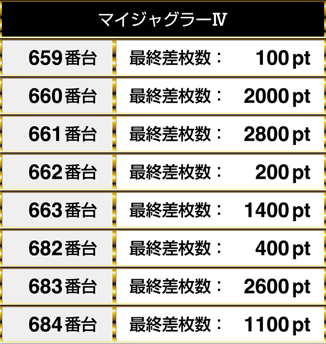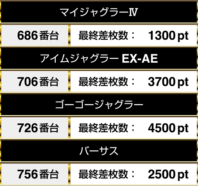 『アイムジャグラーEX-AE』の706番台は3700pt、『バーサス』の756番台は2500ptを記録してこの日を終えていた。