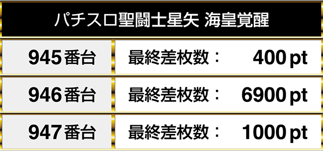 『パチスロ聖闘士星矢 海皇覚醒』の3台が並んでプラスptとなり、そのうちの1台は6000ptオーバー!