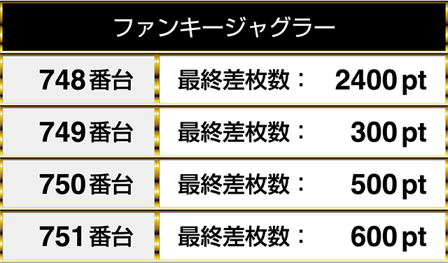 人気を集めていた『ファンキージャグラー』は、2400ptの台を含めて4台が連なってプラスptを記録!!
