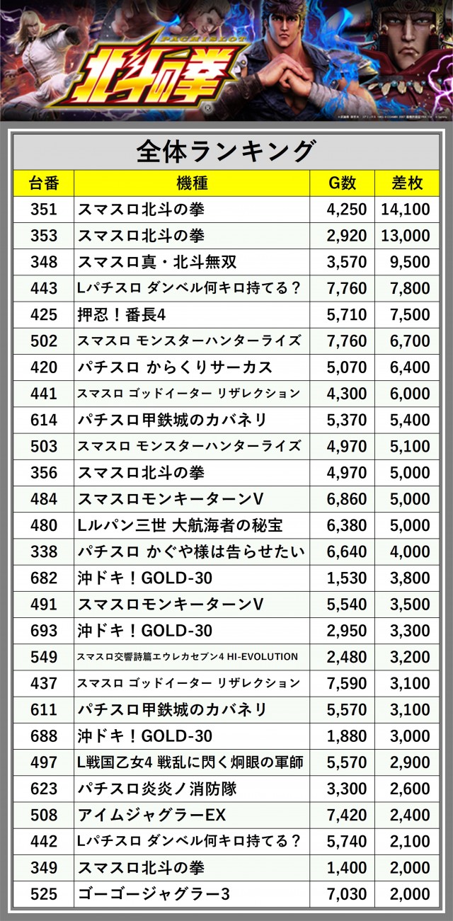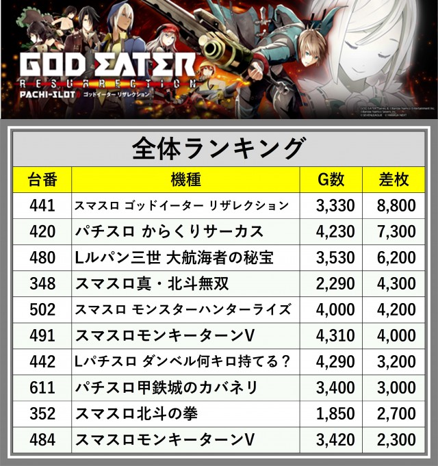 厳選された取材対象機種をはじめ、その他スロット全体から好記録が飛び出した!プレイヤーが楽しんだ1日を下記データにて振り返ってみて欲しい。