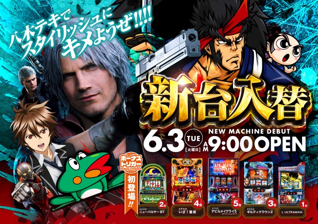 おはようございます(^^)/テキサス八木店です。6月3日(火)新台開店予定全館9時オープン!!