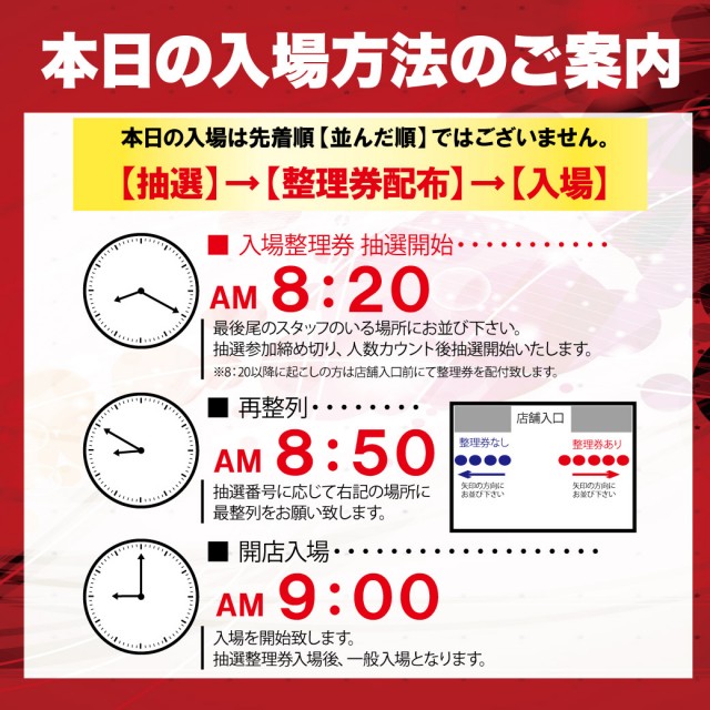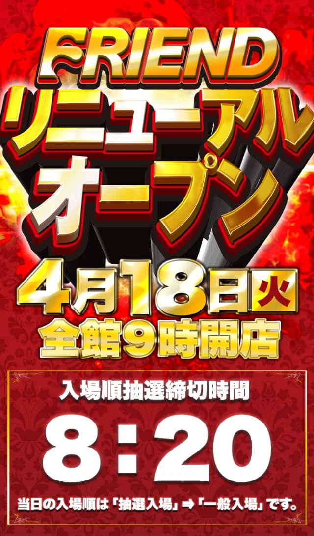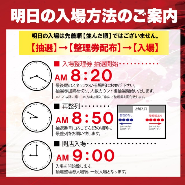 パチンコ:8時より入場整理券配布 / スロット:抽選入場(777CON-PASS) |
