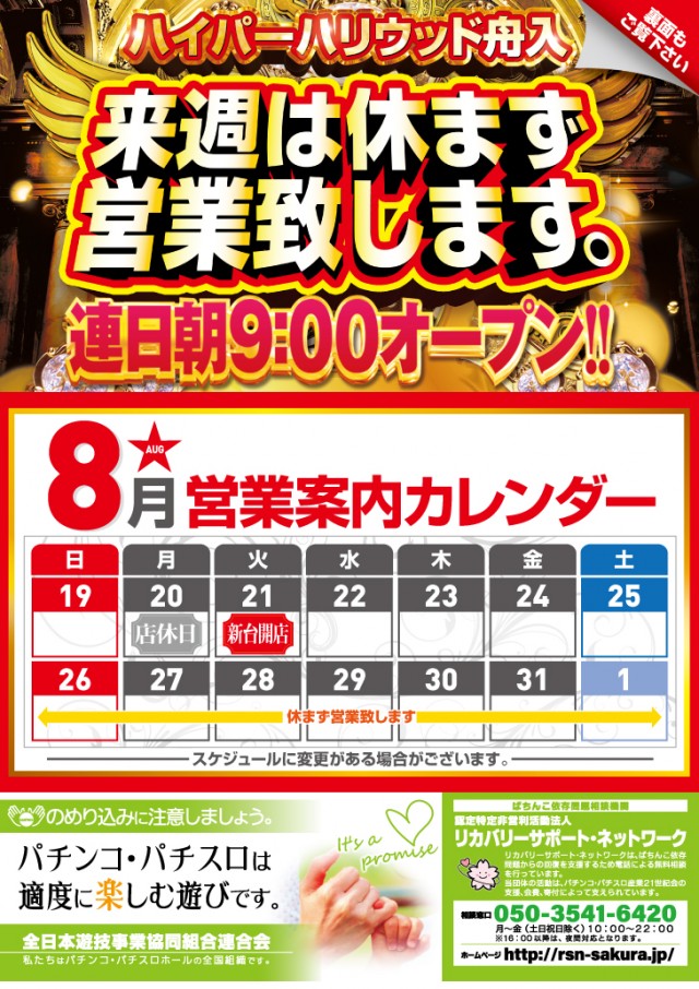 年中無休(ただし新台入替前日はお休みとさせて頂く場合がございます。詳しくはカレンダーをご覧下さい。) |