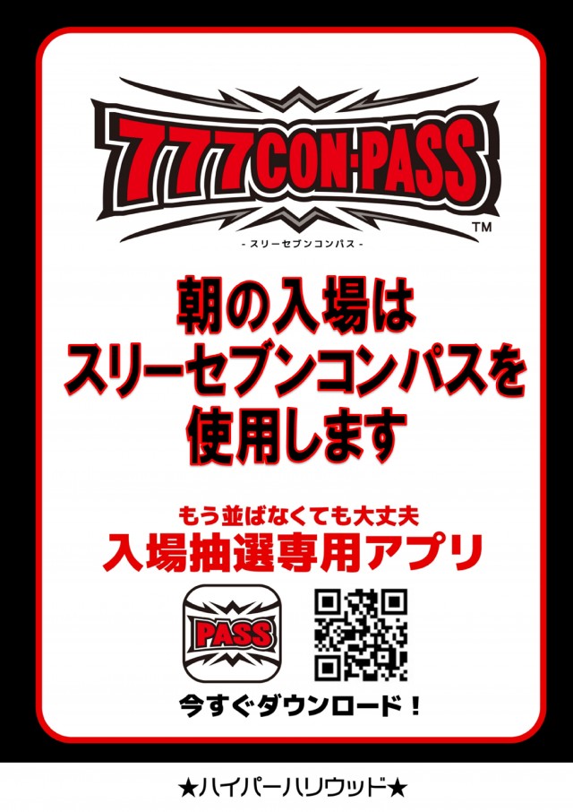 777CON-PASSアプリを利用したオンライン抽選 8時30分抽選 8時45分までに認証 8時50分再整列 (12時開店時、11時30分抽選 11時45分までに認証 11時50分再整列) |