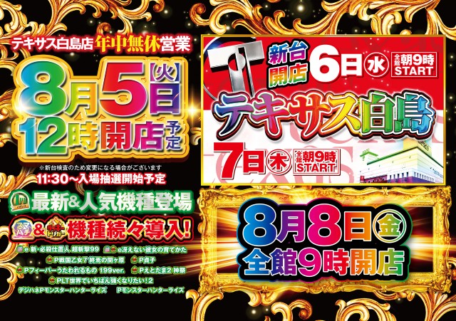 🌈8月も白テキ🌈新台開店🌈本日6日🌈🌈全館9時オープン🌈🌈