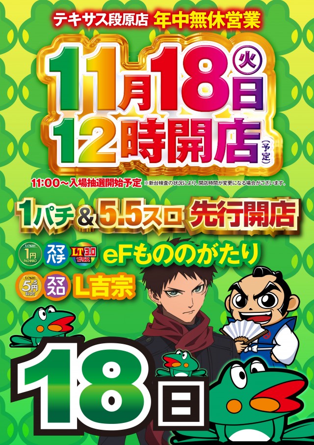 本日11月19日(水)新台開店朝 9時開店!テキサス段原店