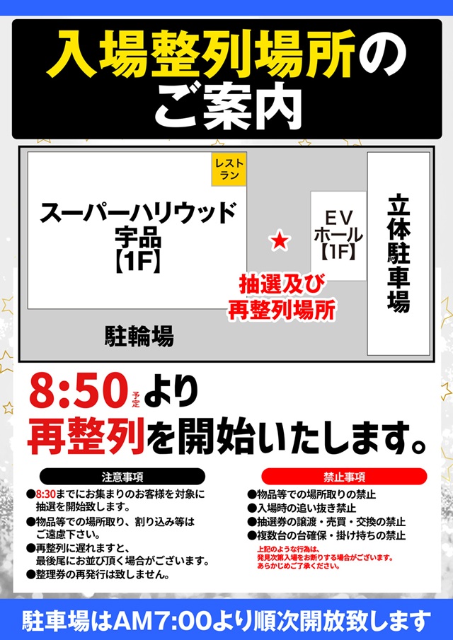 朝8:45より店舗入り口にて入場抽選開始。8時50分より再整列。 |