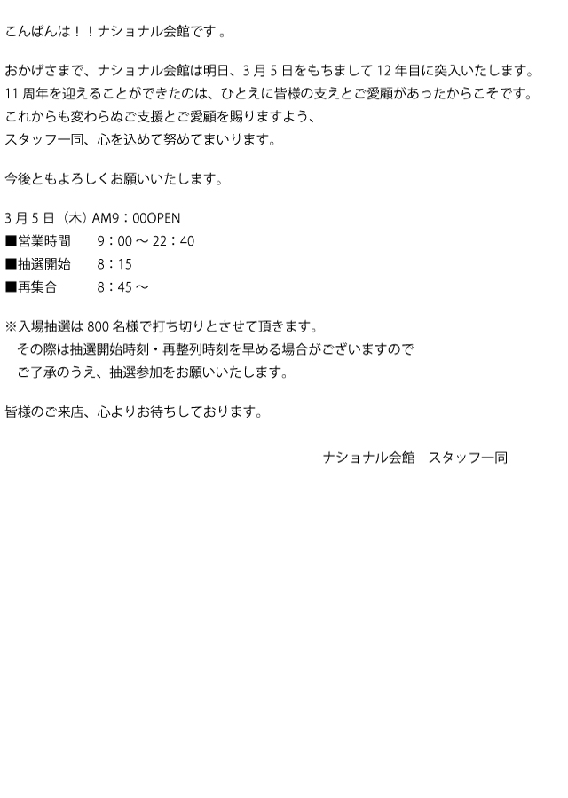 ❗😸明日2日😸❗9時OPEN❗❗😸 ナショナル会館