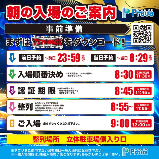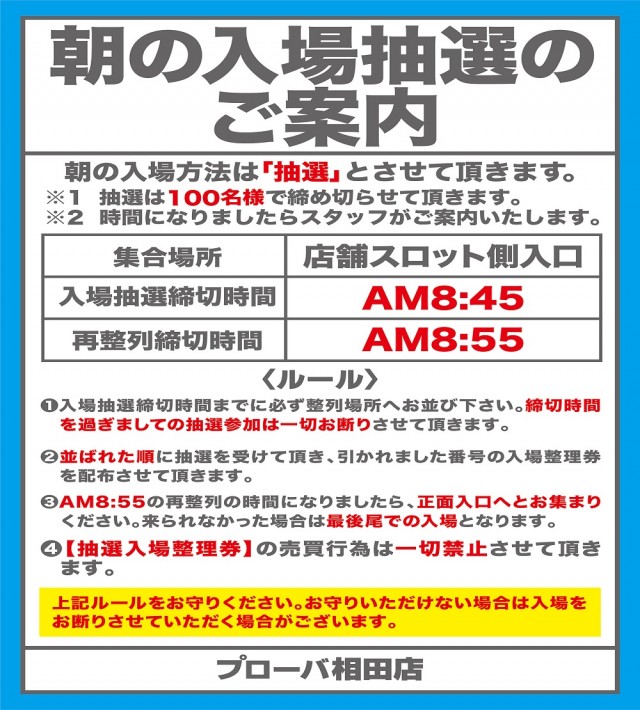 オンライン抽選となっております。事前にアプリダウンロード後、予約をお願い致します。①8:29 抽選予約締切 ②8:30 入場順番決め ③8:45 認証期限 ④8:55 整列 ⑤9:00 入場開始 |