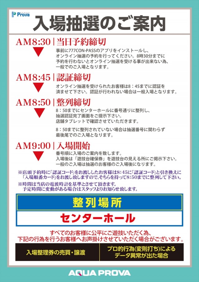 オンライン抽選となっております。事前にアプリダウンロード後、予約をお願い致します。1⃣8:30 抽選予約締切 2⃣8:40 認証締切 3⃣8:40~8:45 再抽選 4⃣8:45~8:50 整列 5⃣9:00 入場開始 |
