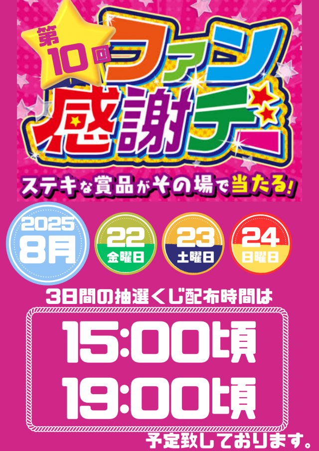 8月24日(日)ファン感謝デー全館9時スタート!!