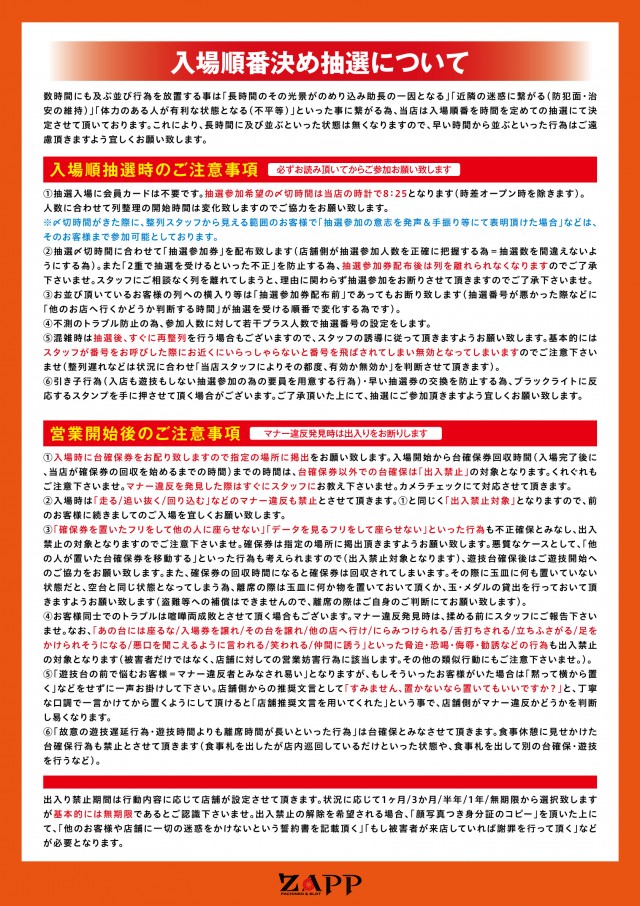 8:15(抽選参加券配布) 8:30(入場順決め抽選) 8:50(抽選参加者様再整列) 9:00(入場開始) |