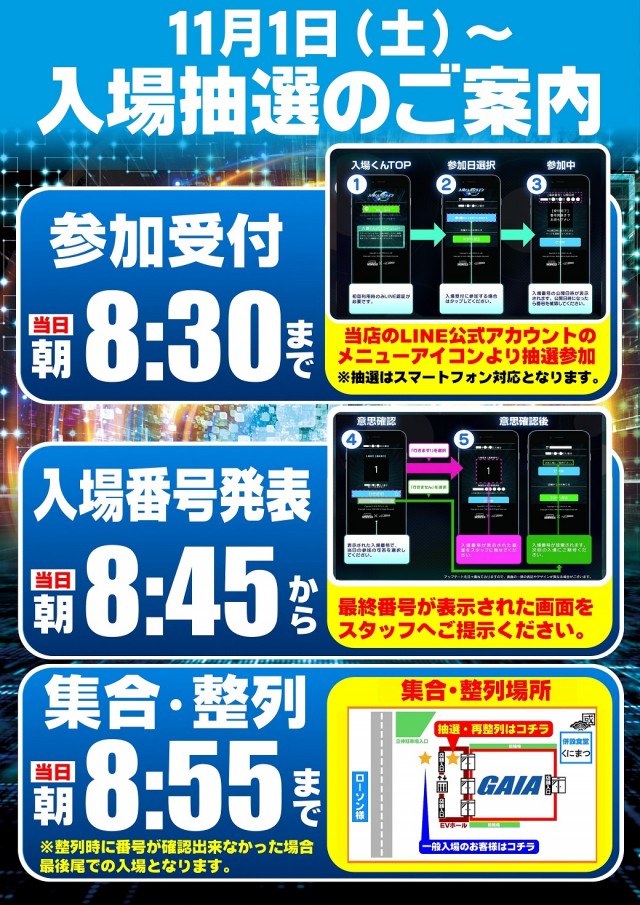 オンライン申し込み→前日12:00~当日8:30 番号発表→当日8:45 整列→8:55 入場→9:00 抽選申し込み→当店公式LINEより |
