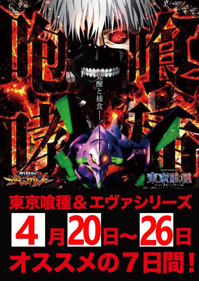 明日は、新台入替2日目!山佐・エヴァ東京喰種オススメ週間中!