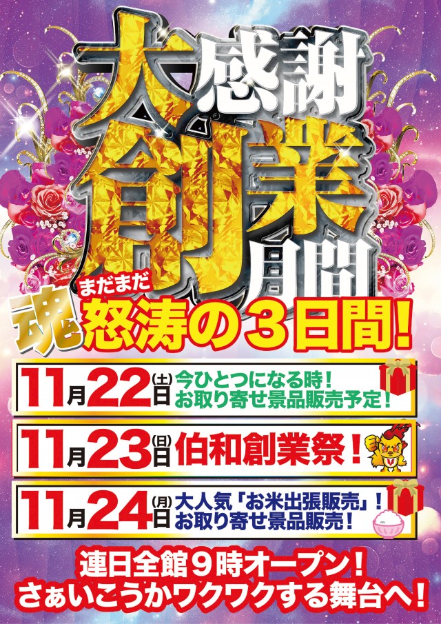 創業月間!本日は、新台入替2日目の全館9時オープン!!