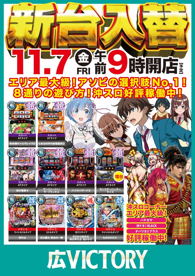 創業月間!明日は、話題機種続々導入の新台入替初日予定!