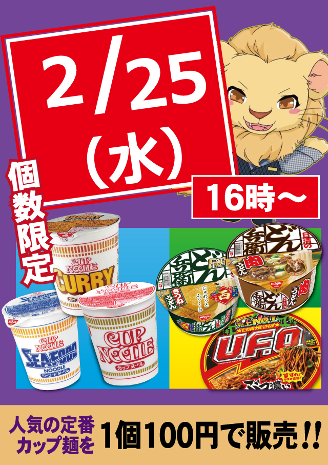明日は定休日返上&100円カップ麵出張販売♪