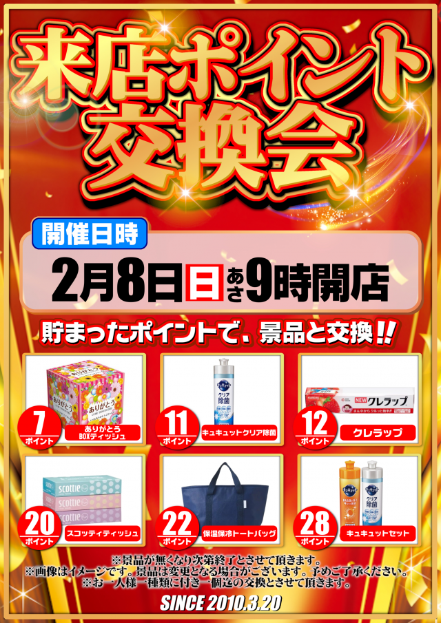 本日2月8日朝9時オープン‼来店ポイント交換会実施‼