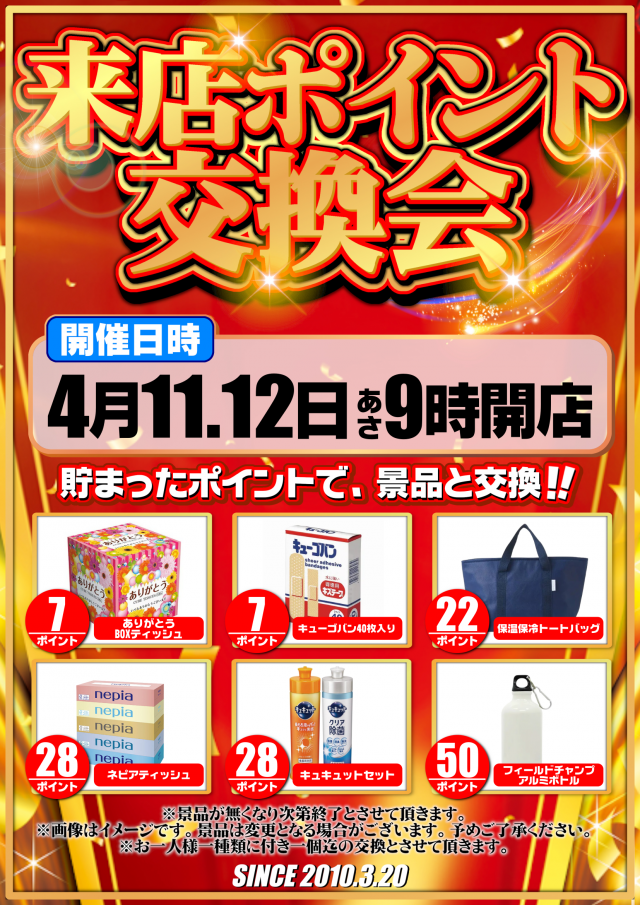 本日4月12日朝9時オープン‼本日来店ポイント交換会開催‼