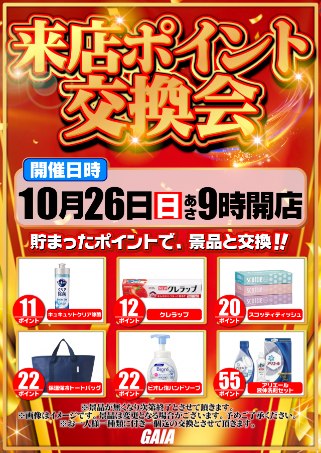 本日10月26日朝9時オープン‼本日来店ポイント交換会開催‼
