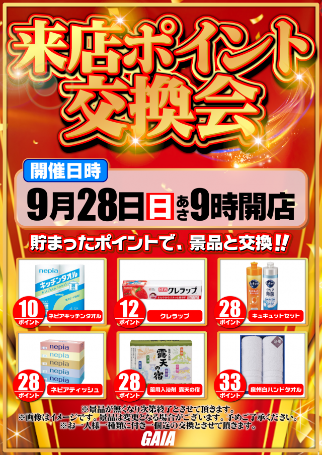 本日9月28日朝9時オープン‼本日来店ポイント交換会開催‼