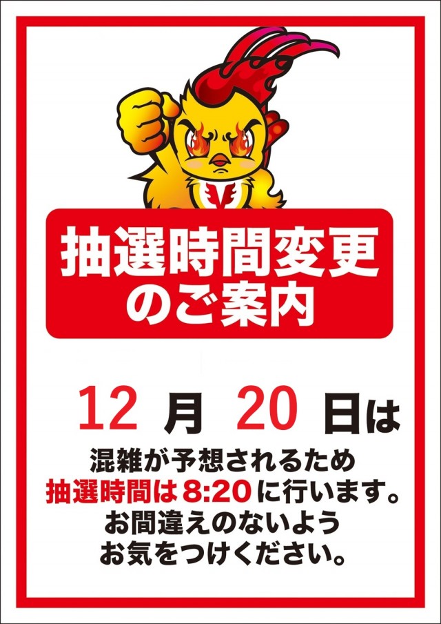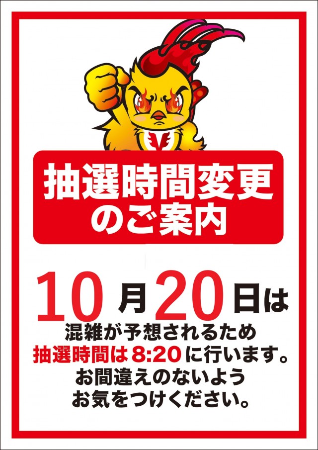 8時30分より入場抽選会を致します、8時50分より整理券順に整列ください。 |