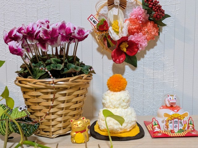 鏡餅2つ並んでますが、1つは毛糸なんです。