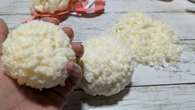 毛糸でポンポンを作る要領でお餅と橙の部分を作って、形を整え重ねれば出来あがり!