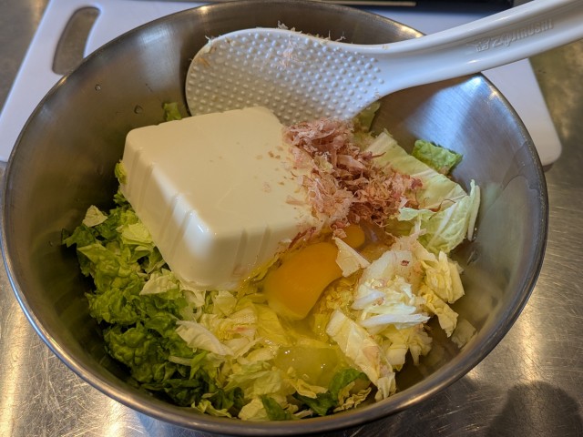 白菜、絹豆腐、鰹節に片栗粉、卵