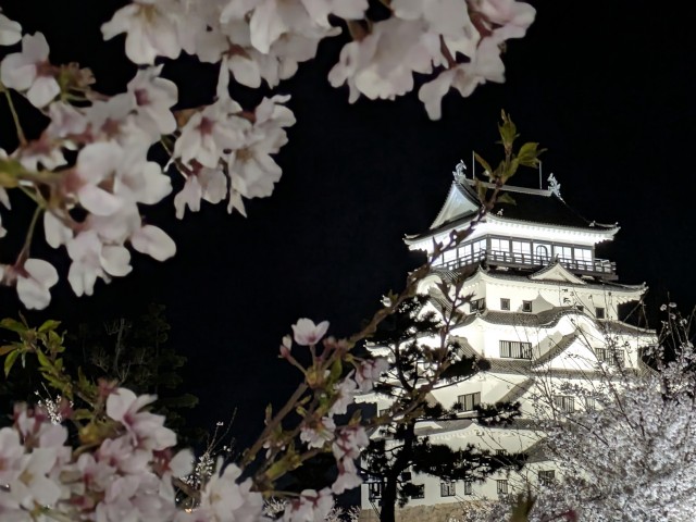 夜桜に選んだのは福山城、お城がライトアップされていました。