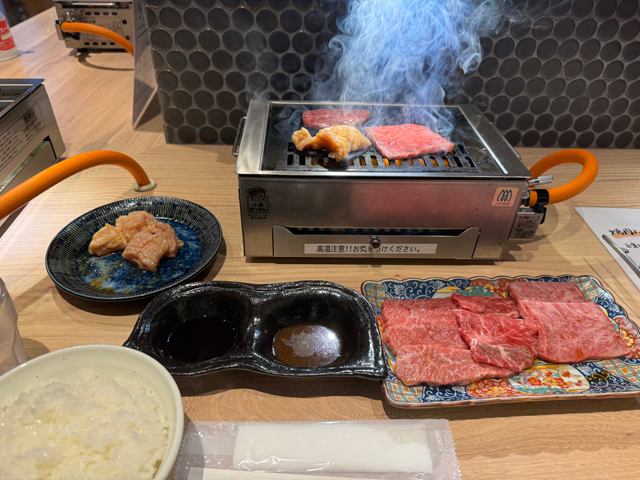 揃えた物販コーナーと、焼き肉・炭火丼飲食ブースを