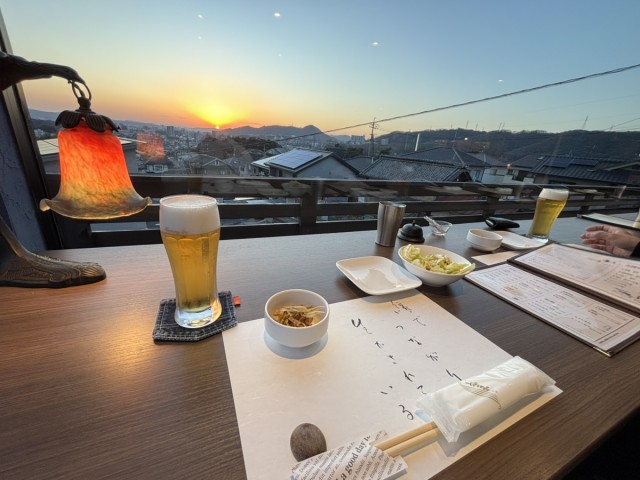 沈みゆく夕日を眺めながら焼き鶏と早くも日本酒をかましている様子。