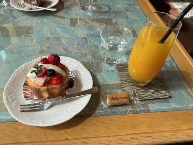 ホテルで食べたケーキもオレンジジュースもめっちゃうま。