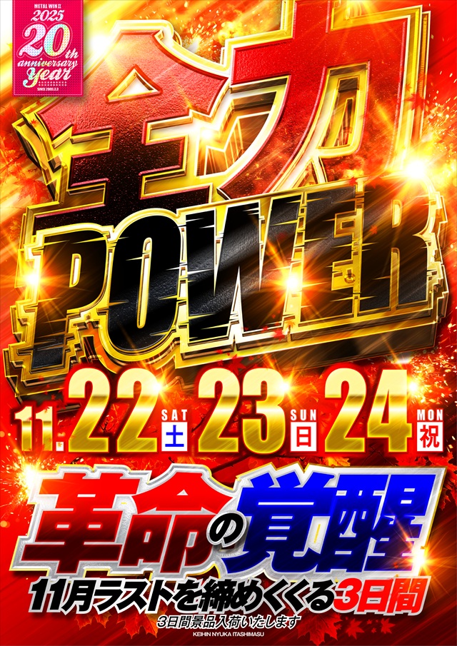 みなさま おはようございます❕メタルウィンⅡです✨いくぞ❕革命の覚醒❕❕✨本日11月24日(月)⚡人気屋台来店⚡朝8時30分より入場整理抽選を行います❕