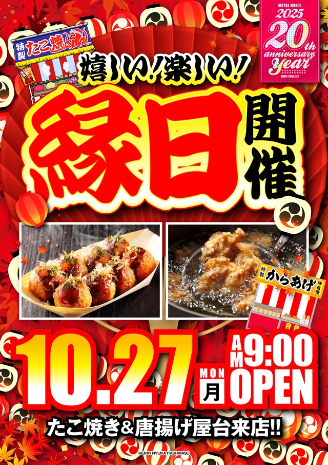 2025/10/27本日は⚡人気屋台来店✊縁日開催❕⚡朝8時30分より抽選開始みなさま おはようございます❕メタルウィンⅡです✨雄たけびを共に上げろ✊✨本日10月27日(月)✨縁日✨⚡人気屋台来店⚡朝8時30分より入場整理抽選を行います❕   メタルウィンⅡ店舗外海側正面口にて入場整理抽選を予定しておりますので入場整理抽選を希望のお客様は奮ってご参加くださいませ❕❕ メタルウィンⅡ店舗外海側正面口にて入場整理抽選を予定しておりますので入場整理抽選を希望のお客様は奮ってご参加くださいませ❕❕ ✨雄たけびを共に上げろ❕❕✨✨年間オススメ 北斗の拳✨⚡南斗 最後の将⚡ ✨雄たけびを共に上げろ❕❕✨✨年間オススメ 北斗の拳✨⚡南斗 最後の将⚡ ✨いつものアイツと遊ぼう❕❕✨✨ジャグラー団結✊✨ ✨いつものアイツと遊ぼう❕❕✨✨ジャグラー団結✊✨ ✨東京リベンジャーズ✨⚡10月 ハロウィン決戦❕❕⚡ ✨東京リベンジャーズ✨⚡10月 ハロウィン決戦❕❕⚡ ⚡地域最大級設置⚡✨モンキーターンⅤ✨ ⚡地域最大級設置⚡✨モンキーターンⅤ✨ ⚡東京喰種⚡⚡退かない、前に進む❕❕⚡ ⚡東京喰種⚡⚡退かない、前に進む❕❕⚡ ⚡拡大パワーアップ❕❕⚡✨NEW A-TYPE✨ ⚡拡大パワーアップ❕❕⚡✨NEW A-TYPE✨ ⑤ALL SMART SLOT⑤最新台が5スロで打てる✊ ⑤ALL SMART SLOT⑤最新台が5スロで打てる✊ 他にも話題の機種から✊人気機種まで✊⚡全268台⚡でお出迎え致します❕❕本日もスロットするなら楽しさ最大SLOT専門店メタルウィンⅡへ❕❕ 他にも話題の機種から✊人気機種まで✊⚡全268台⚡でお出迎え致します❕❕本日もスロットするなら楽しさ最大SLOT専門店メタルウィンⅡへ❕❕