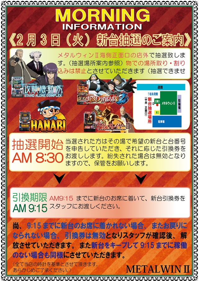 8時30分から抽選を開始します。整理券配布時の物品等での場所取り及び、入場後の台取り、掛け持ち遊技は確認次第、撤去させて頂きます。 |