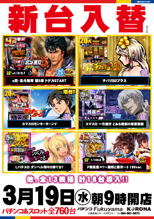 明日3月19日(火)福山コロナ新台入替朝9時オープン!!