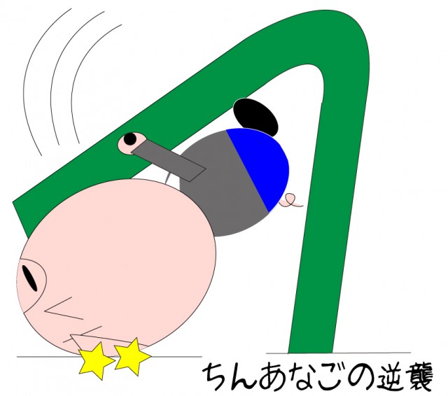 一瞬状況が掴めなかったものの、どうやらちんあなごにぶら下がった時に体重に耐えきれず一気に曲がったために地面に激突した模様・・・