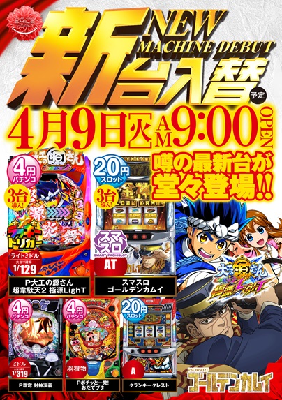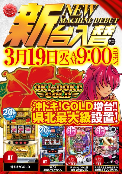 本日は新台入替初日 9:00開店!8:40~整理券配布!