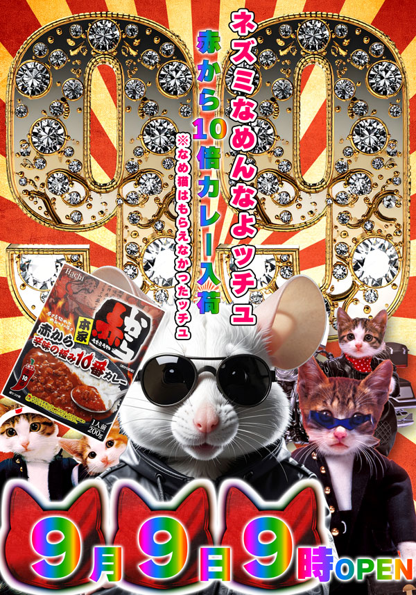 明日9月9日9時オープンッチュ🐭赤からカレー10倍入荷ッチュ