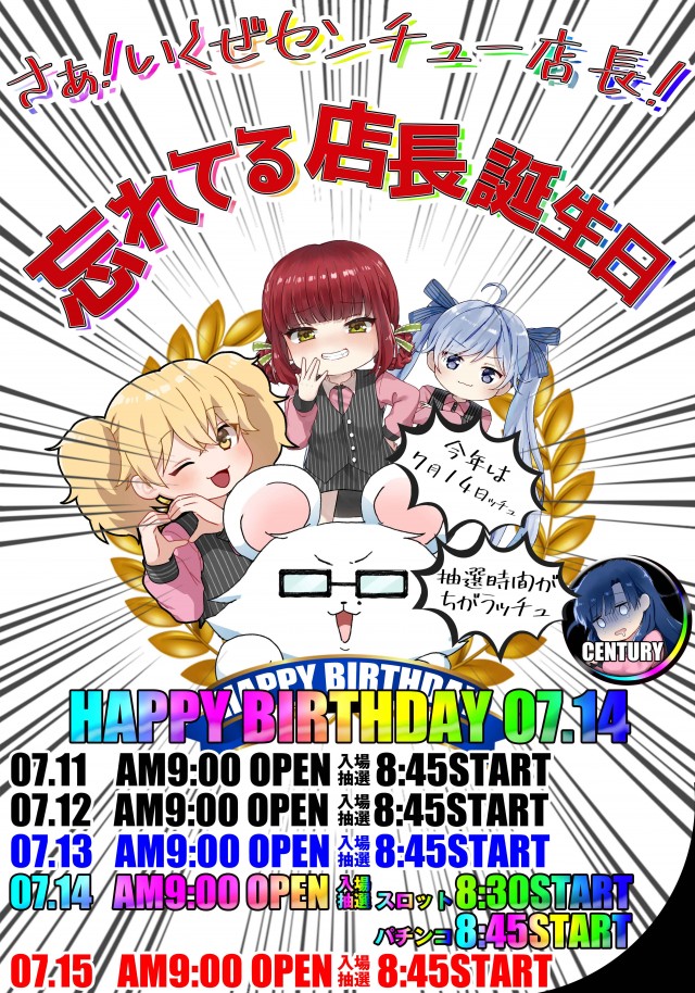 今日はセンチュー店長の誕生日ッチュ🐭🌈8時30分抽選開始🌈