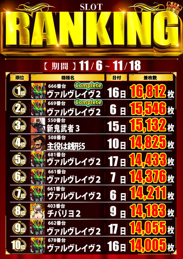 1位 11月6日(木) 2位 11月9日(日) 3位 11月4日(火)