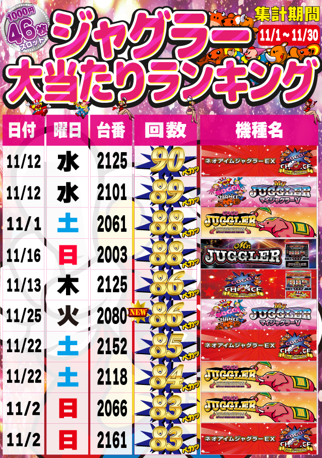 1位 11月22日(土) 2位 11月24日(月) 3位 11月23日(日)