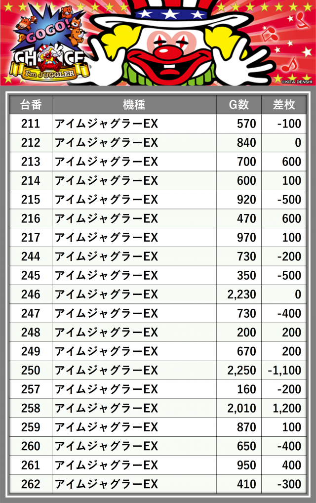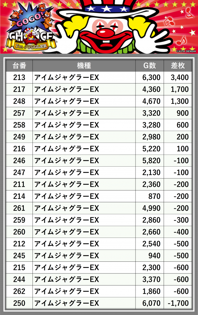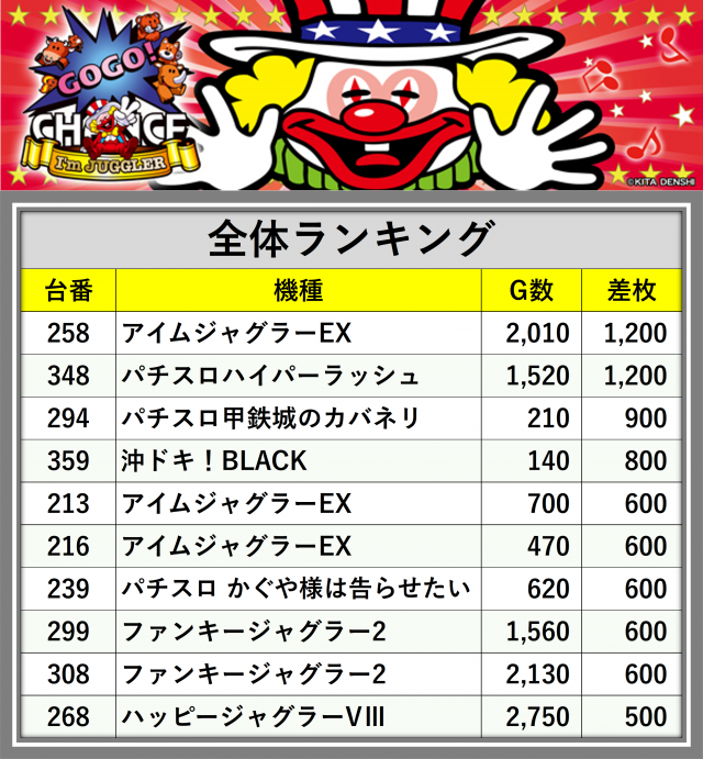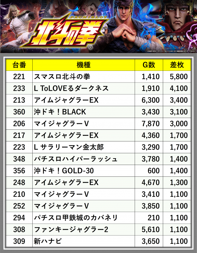 厳選された取材対象機種をはじめ、その他スロット全体から好記録が飛び出した!プレイヤーが楽しんだ1日を下記データにて振り返ってみて欲しい。