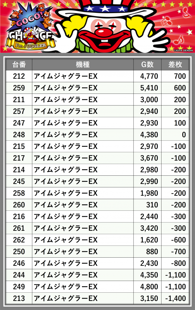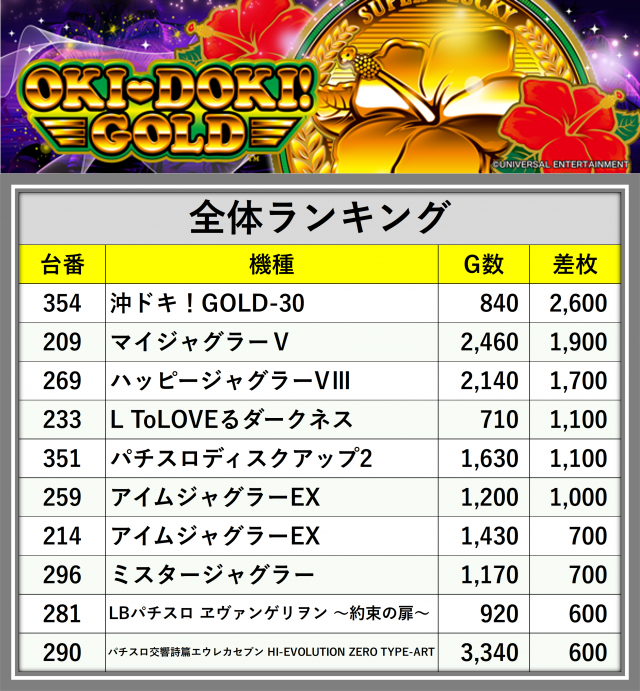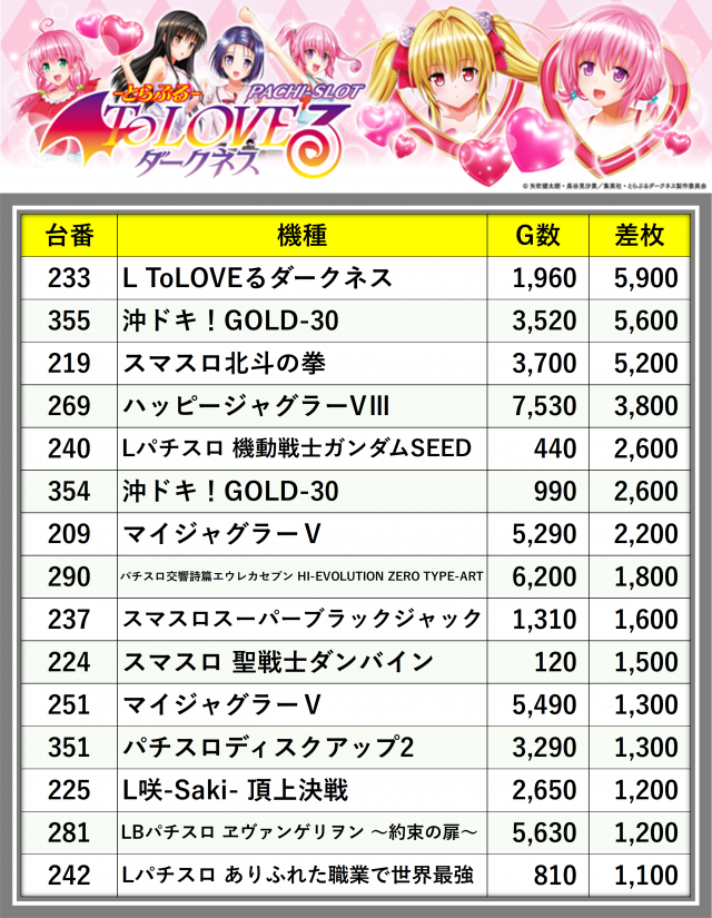 厳選された取材対象機種をはじめ、その他スロット全体から好記録が飛び出した!プレイヤーが楽しんだ1日を下記データにて振り返ってみて欲しい。
